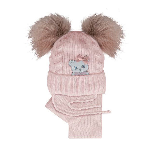 Zimná súprava pozostáva z dvojvrstvovej čiapky s dvomi roztomilými bombuľkami a šálu, ktoré spoločne poskytujú maximálny komfort a ochranu pred zimou.