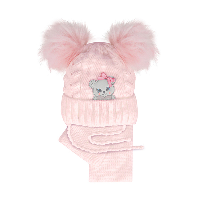 Zimná súprava pozostáva z dvojvrstvovej čiapky s dvomi roztomilými bombuľkami a šálu, ktoré spoločne poskytujú maximálny komfort a ochranu pred zimou.