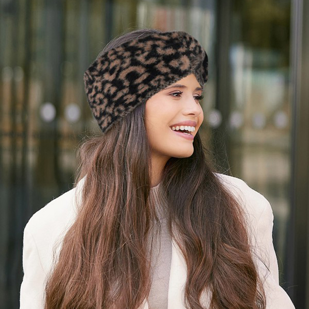 Úvod » AJS čiapky ZIMA » Dámska čelenka na zimu s leopardím vzorom 56-58 cm