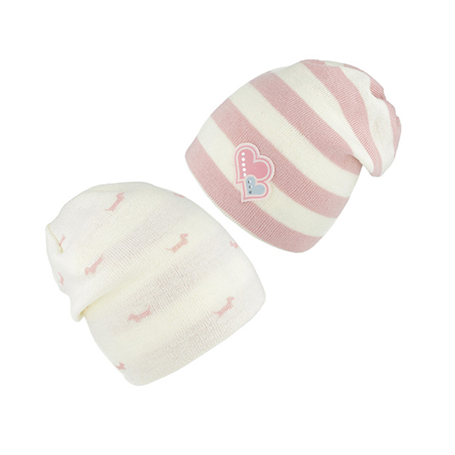 Jedna strana čiapky je zdobená prúžkami, druhá je jednofarebná, s drobným vkusným vzorom, psíkami.